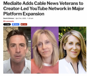 Reporter David Gilmour said that Mediaite founder Dan Abrams is planning to “bring trusted media voices directly to digital audiences. No network filter, no gatekeeping, just platform-first news and commentary built for the YouTube era.”
